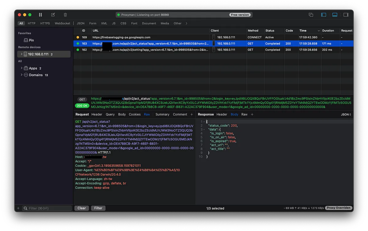 万事はスニッフィングから始まります。この部分については、以前の記事「 APPはHTTPS通信を使っているのに、データが盗まれた。 」および「 Python+Google Cloud Platform+Line Botを使って定例作業を自動化する 」を参照してください。最初の記事で原理を理解し、二番目の記事の Proxyman を使ったスニッフィングをおすすめします。
