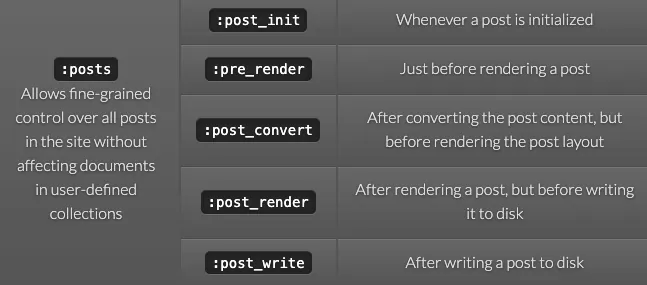 第二の方法は、Plugin の中の Hook を使い、Jekyll が静的コンテンツを生成する段階で自分のカスタマイズした内容を注入する方法です。