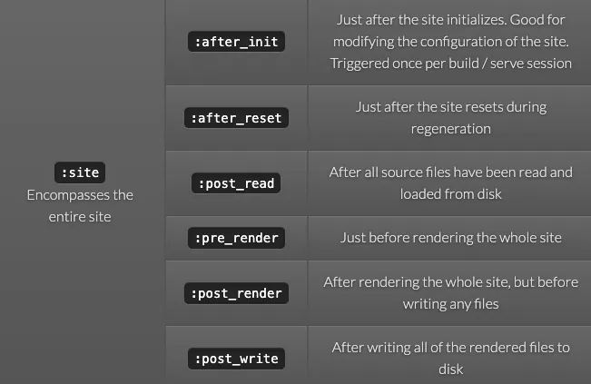 Jekyll::Hooks.register :site, :pre_render do \\|site\\|