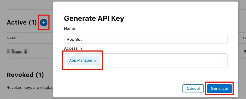 「+」をクリックし、名前と権限を入力します。権限の詳細は公式サイトの説明を参照してください。テストの問題を減らすため、ここではまず「App Manager」を選択して最大の権限を付与します。