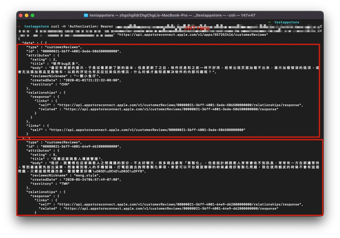 curl -H 'Authorization: Bearer JWT' "https://api.appstoreconnect.apple.com/v1/apps/APPID/customerReviews"