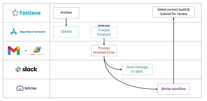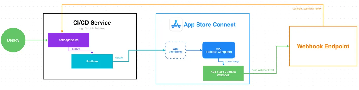 App Store Connectのビルドプロセス完了後にWebhook通知が送信され、通知を受け取った後に審査申請のステップを続行します。
