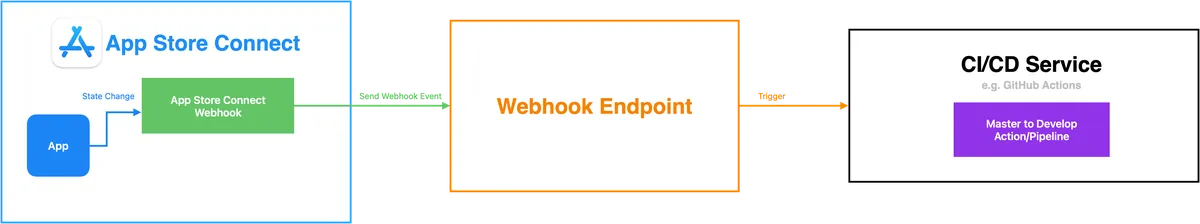 Webhook があれば、App のリリース通知を受け取った後に直接 CI/CD アクション(Master から Develop へ)をトリガーできます。