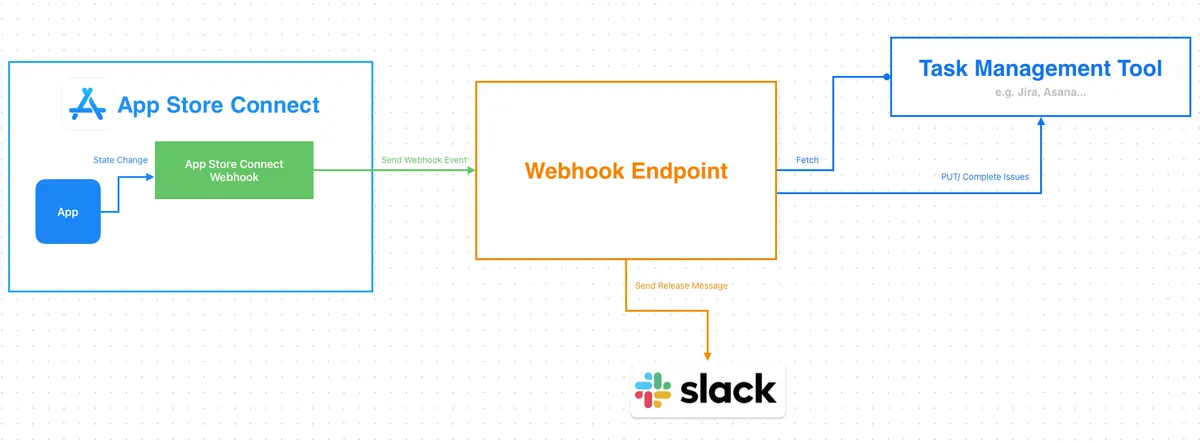 - Webhook があれば、App のリリース通知を受け取った後に Jira/Asana API と連携して該当バージョンのチケットを一括で完了し、完了したタスクのリリースメッセージを Slack に投稿できます。