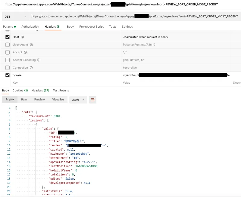 AppleはApp Store Connect APIを提供していますが、レビュー取得機能はありません。