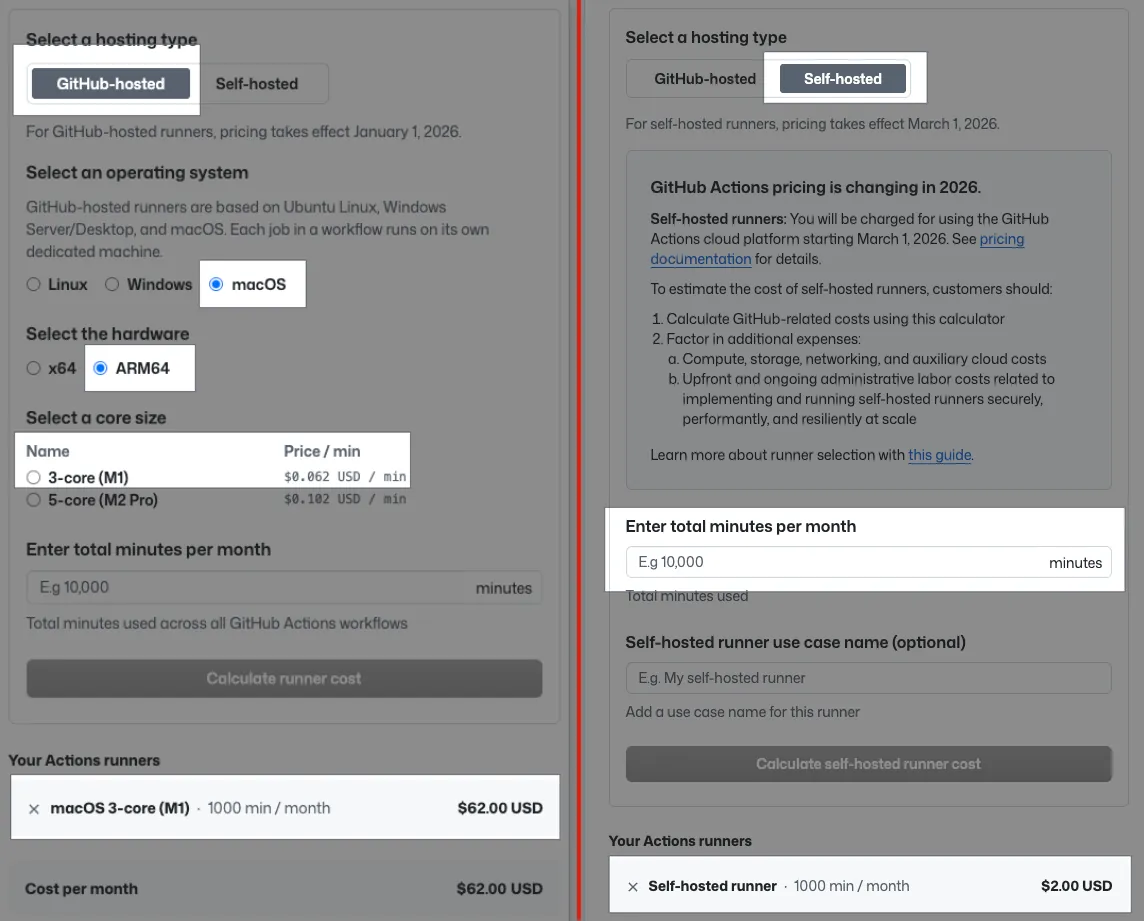 GitHub Hosted Runner — macOS 3コア(M1): $0.062 USD/分、1,000分で $62 USD