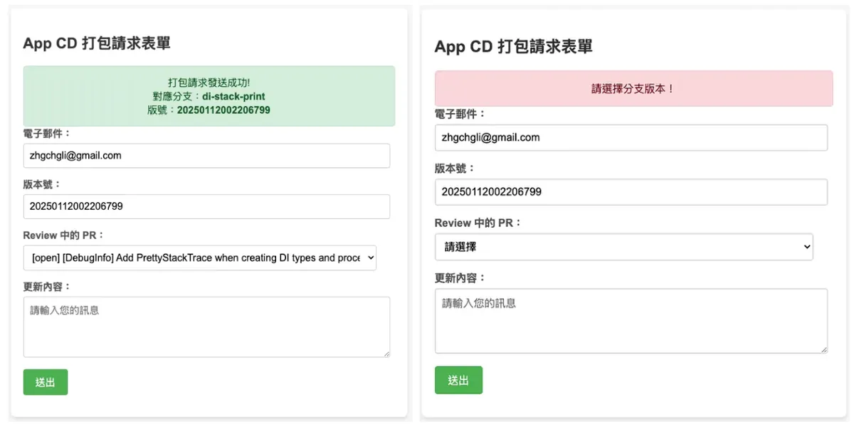 この使いやすい「インターフェース」で必要な情報を入力し、プロジェクト管理ツール(例:Jira、Asana)からタスクを取得したり、GitHubから直接PRリストを取得して、プルダウンメニューで選択後に送信します。さらにGitHub APIを通じてGitHub Actionsをトリガーし、ビルドを実行します。