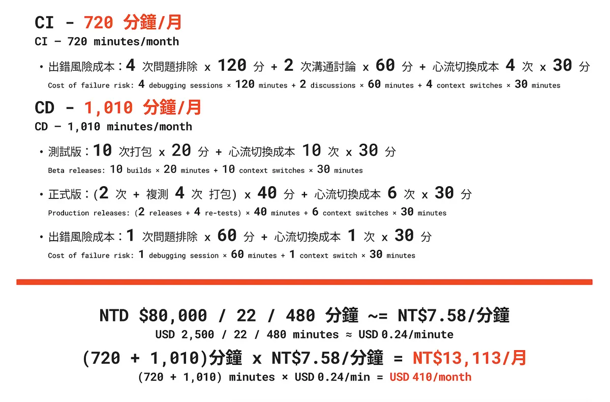 声明: ここでは一つの効果計算方法を示しただけで、必ずしも最も正確なものではありません;あくまで管理層がCI/CDの効果を理解し、意思決定と推進の許可を得るための概念提供です。