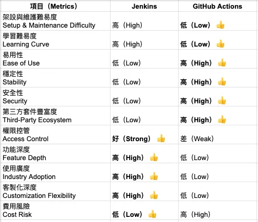 この点は比較できません。Jenkinsはほぼ20年の実績がありますが、GitHub Actionsはまだ多くの機能を補う必要があります。例えば、権限管理、Secret管理(現状はテキストのみ対応で、鍵ファイルは先にテキスト化が必要)、Cache/Artifactは現在クラウドのみ対応、などです。