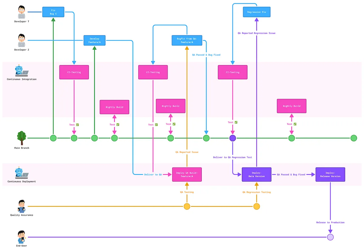 すべての開発が完了した後、Developer Z は 自分のパソコンでビルドしたバージョンをQAに渡し、テストを行い、修正とビルドを何度も繰り返す。最終的に問題がなければ、機能を main ブランチにマージします。