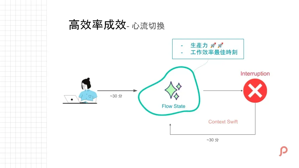 私たちが一定時間作業を続けると「フロー」状態に入ります。この時、思考や生産性がピークに達し、最も効果的な成果を出せます。しかし中断されると、再びフローに戻るまでに時間がかかります。ここでは30分を例とします。
