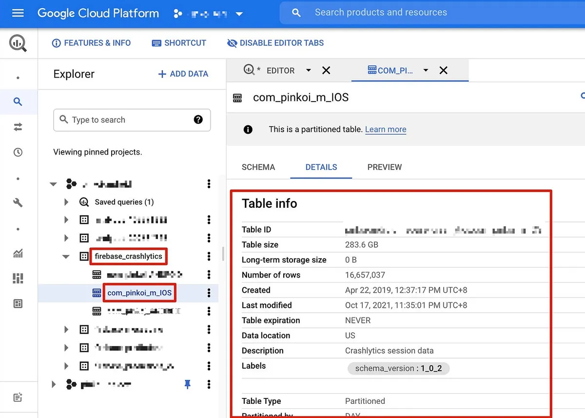 GCP の Big Query に移動後、左側の「Explorer」から「firebase_crashlytics」を選択し、テーブル名を選択して「Detail」をクリックすると、右側に最新の更新日時、使用容量、保存期間などのテーブル情報が表示されます。