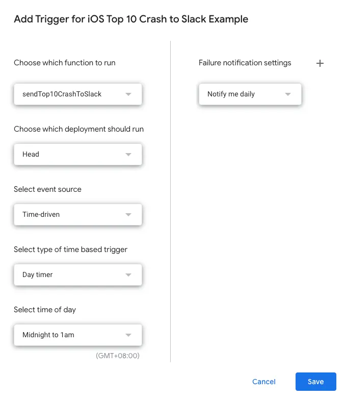 最初の「Choose which function to run」(実行する関数の選択)は sendTop10CrashToSlack に変更してください。実行間隔はお好みで設定可能です。