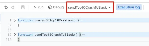次に、上部の「sendTop10CrashToSlack」関数を選択し、Debug または Run をクリックして一度テスト実行してください。初回実行時は認証が必要なため、少なくとも一度実行してから次のステップに進んでください。