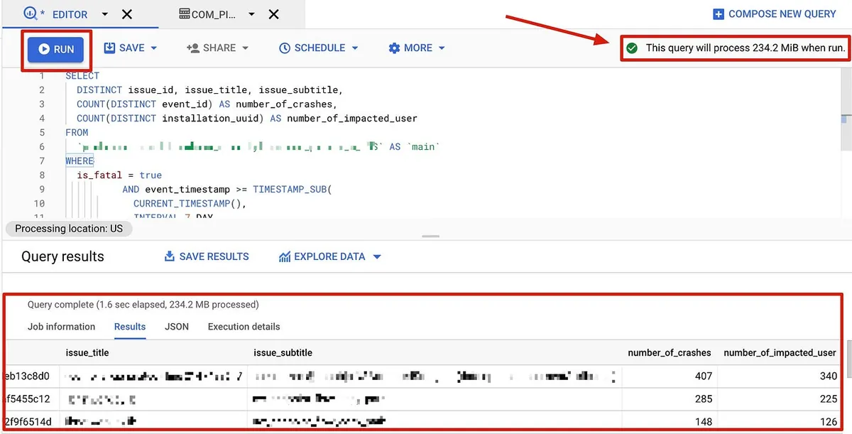⚠️ 「RUN」を押してクエリを実行するとクエリ使用量が累積され、料金が発生します。無闇にクエリを実行しないようご注意ください。