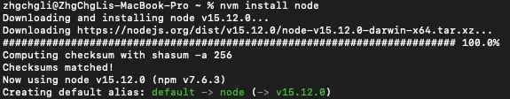 次に nvm install node を使って最新版の node.js をインストールできます。
