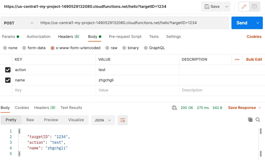 上記の内容を貼り付けて、パスインターフェース /hello を定義しました。これにより、URLのクエリ ?targetID=、POSTの action、name パラメータ情報を返します。