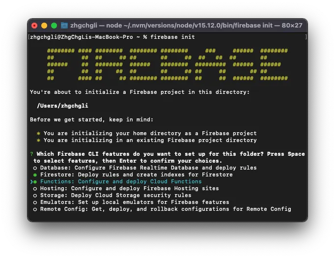 ここではインストールする Firebase CLI ツールを選択できます。「↑」「↓」キーで選択し、「スペースキー」で決定します。ここでは「Functions」のみ、または「Firestore」も含めて選択してインストールできます。