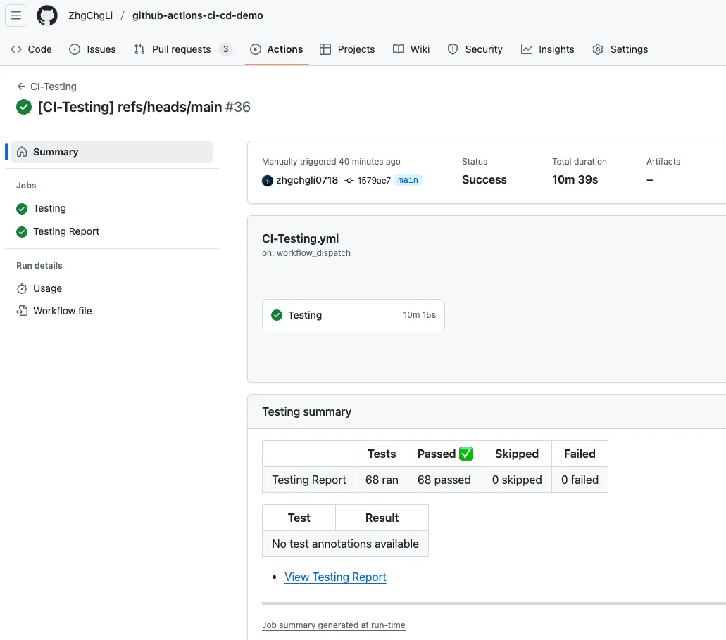 Commit ファイルをリポジトリのメインブランチにプッシュし、手動でテストとビルドをトリガーして結果を確認します: