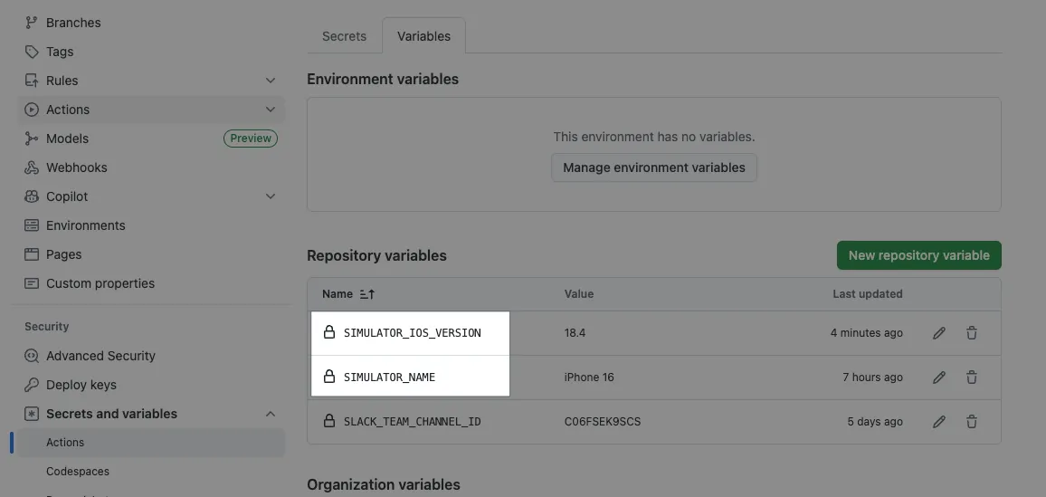 deviceを${RUNNER_NAME} (${SIMULATOR_IOS_VERSION})に変更SIMULATOR_IOS_VERSIONは引き続き Repo variables の変数を参照します。