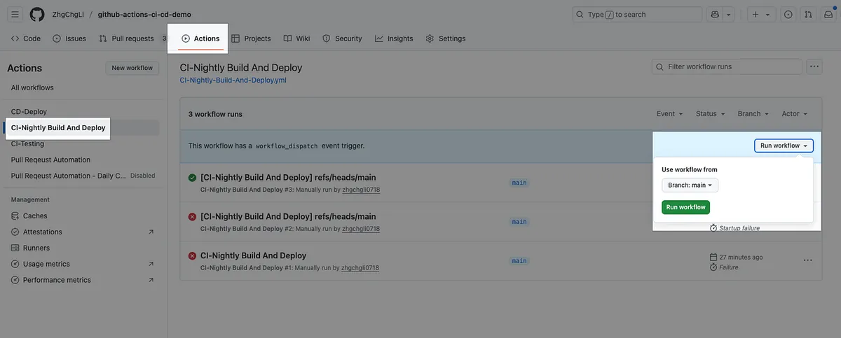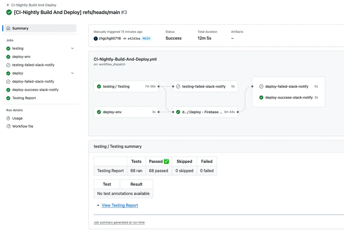 この Action は前に設計した CI-Testing と CD-Deploy をそのまま再利用し、Nightly Build に組み合わせています。非常に柔軟で使いやすいです!