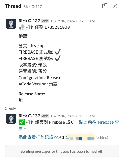 以前、チームには自動化を熱愛するメンバーがいて、Kotlin+Ktor を使って完全な Slack App のウェブサービスを構築しました。Slack のメッセージ、フォーム、コマンドなどの機能と連携し、CD パッケージのリクエストを受信・転送し、GitHub Actions をトリガーして操作を実行し、その結果を Slack に返す仕組みです。