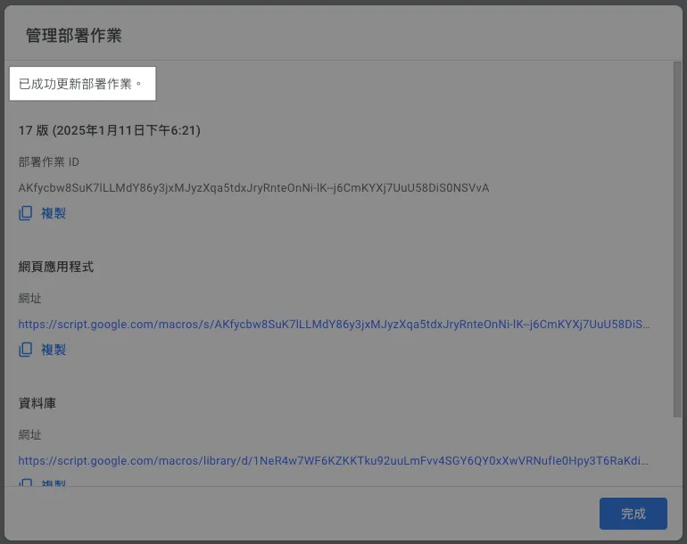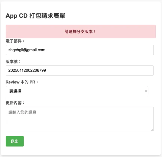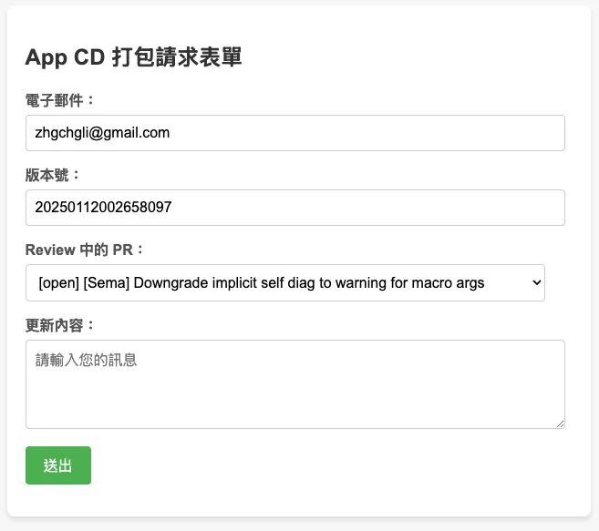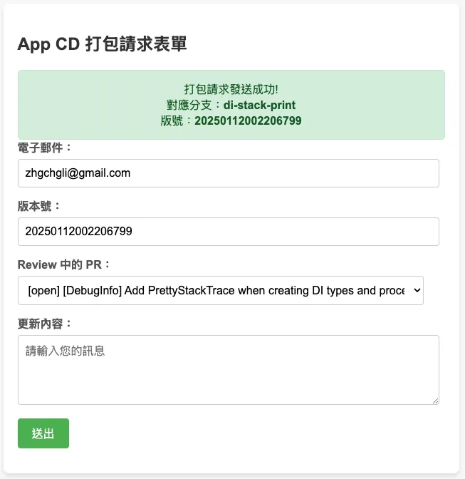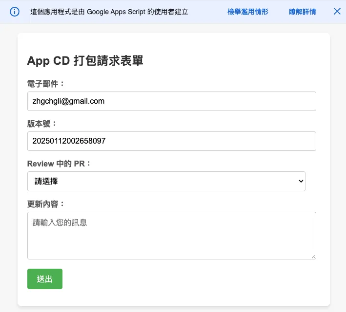 この機能は実際のパッケージングツールに統合されています。最新の記事事例をご参照ください:「CI/CD 実践ガイド(4):Google Apps Script Web App を使って GitHub Actions と連携し、無料で使いやすいパッケージングツールプラットフォームを構築する」
