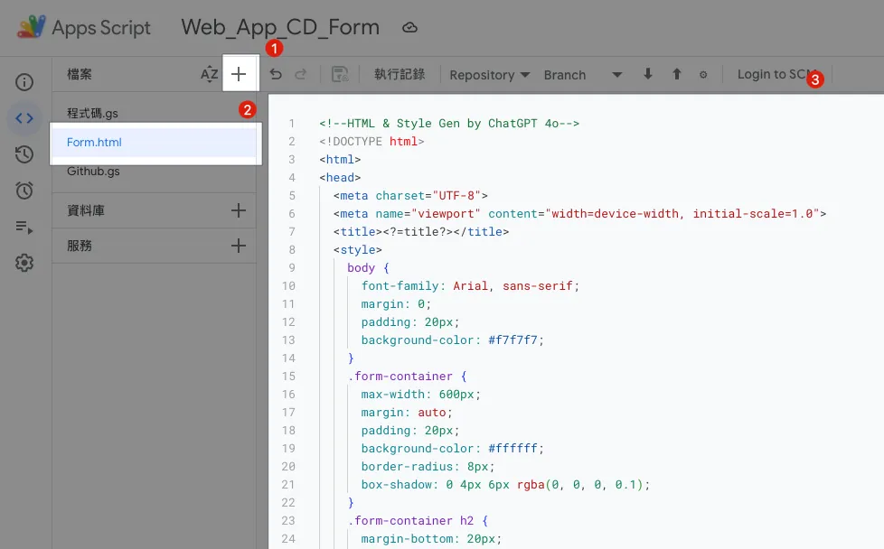 GAS の左側ファイル一覧で「+」をクリックし、新しいファイル名に「Form.html」を入力して、GPT が生成した HTML フォームのテンプレート内容を貼り付けます。