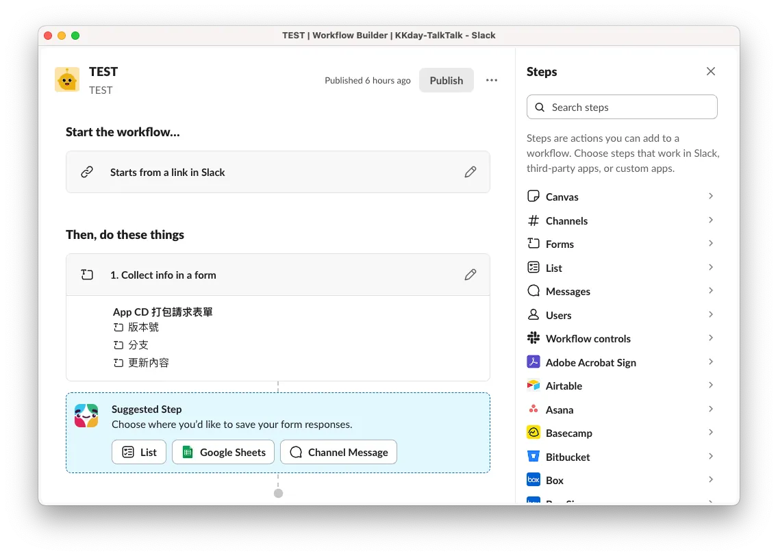 また、Slack内蔵の自動化機能であるWorkflow Formも試しましたが、動的なフォーム内容(例:ブランチを取得してユーザーに選ばせる)はできず、カスタマイズできるのはデータ送信後のステップのみでした。