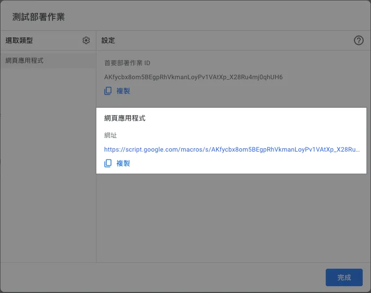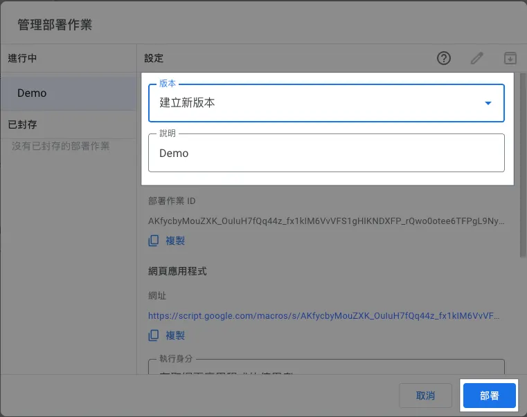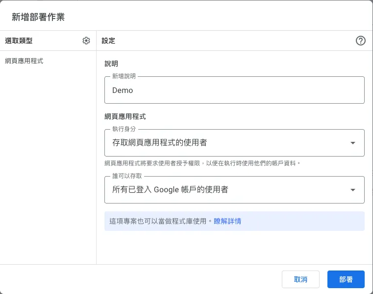 プロジェクト右上の「デプロイ」→「新しいデプロイを追加」→ タイプ「ウェブアプリケーション」: