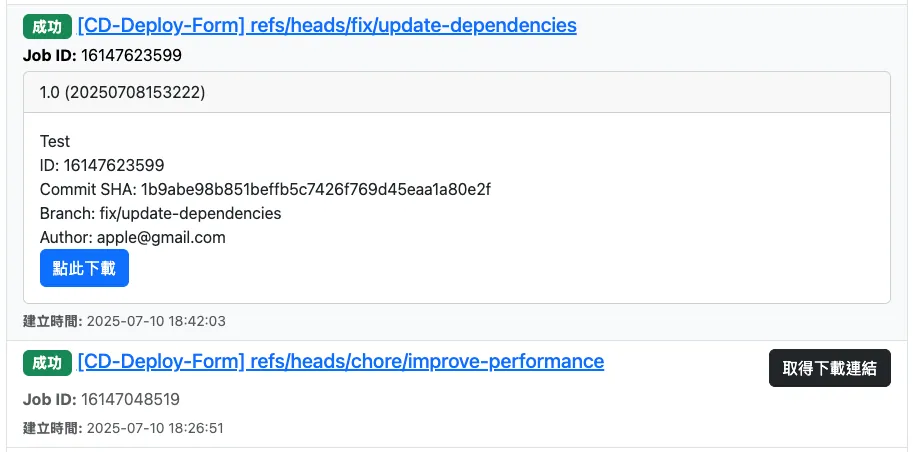 パッケージ記録: パッケージの履歴を記録し、進行中のパッケージタスクの進捗状況を表示。クリックで Firebase App Distribution のダウンロードリンクを取得し、情報を表示