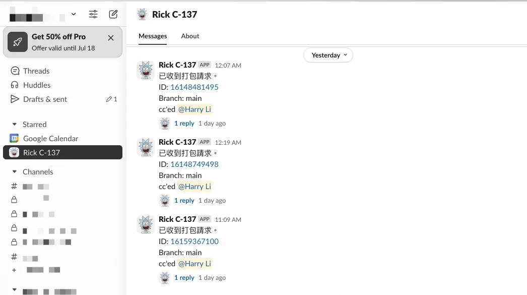 私たちは Slack をパッケージングプラットフォームとして試み、自前でバックエンドサービスを開発し GCP 上に構築しました。Slack API、Asana API と連携し、Slack から送られたフォームを GitHub API に転送して GitHub Actions をトリガーする仕組みです。体験としては非常に快適でチームのコラボレーションツールに統一でき、スムーズに使えました。しかし、欠点は開発およびその後の保守コストが非常に高いことです。Ktor で開発したバックエンドサービスのため、アプリエンジニアがバックエンドも兼任し、Google サービスの OAuth 統合問題を処理し、一部機能(例えば審査送信など)もここで実装する必要があり、機能は複雑でした。後から入った新人が引き継げなければほぼ保守不可能になり、さらに毎月 $15 USD の GCP サーバー費用もかかります。
