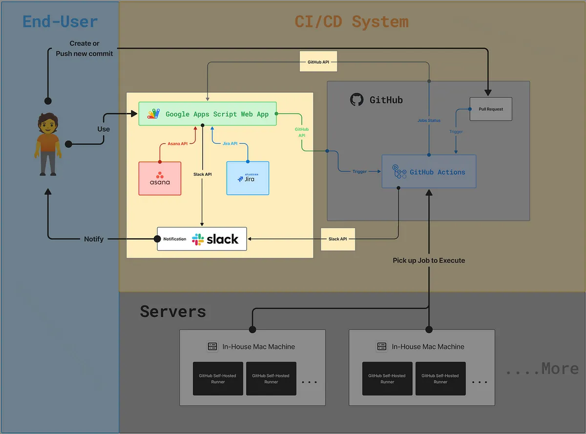 開発チーム向けにGAS Web AppでGitHub、Slack、Firebase、Asana/Jira APIを連携し、中継プラットフォームを構築。打包作業を自動化し、効率的なCI/CD環境を無料で実現します。