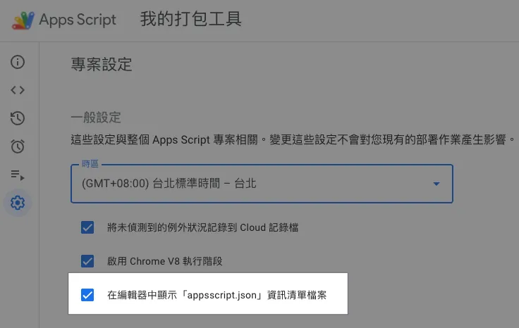 プロジェクト設定 → 「エディタで『appsscript.json』マニフェストファイルを表示する」にチェックを入れると、「appsscript.json」メタデータファイルが表示されます。