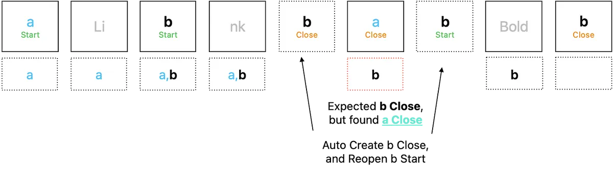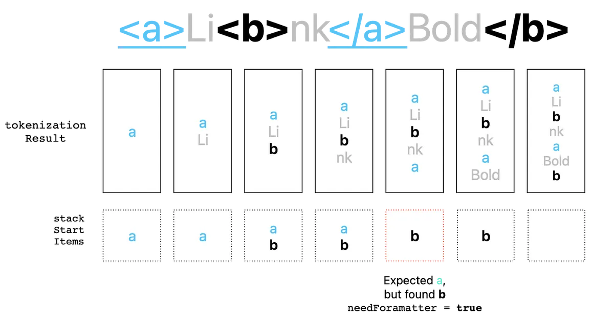 最初はあまり考えずに、「ペア」になったHTMLタグを正規表現で直接抽出し、再帰的に内部のHTMLタグを一層ずつ探していけば良いと思っていました。しかし、この方法ではHTMLタグの入れ子や、不整合のあるタグの許容(エラー耐性)を解決できません。そのため、戦略を変更し、「単一」のHTMLタグを抽出し、それが開始タグ、終了タグ、または自己終了タグかを記録し、その他の文字列と組み合わせて解析結果の配列を作成する方法にしました。