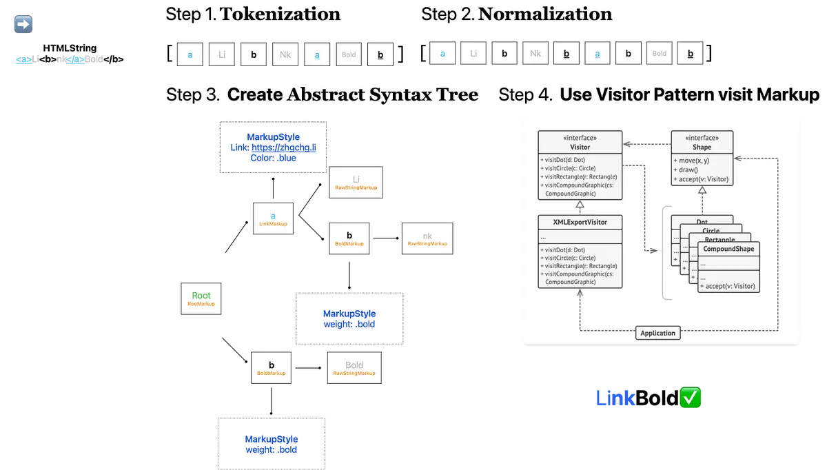 純粋な Swift で開発し、Regex を使って HTML タグを解析しトークナイズします。タグの正確性を解析・修正(終了タグのないタグや位置のずれたタグの修正)した後、抽象構文木に変換します。最終的に Visitor パターンを用いて HTML タグと抽象スタイルを対応させ、最終的な NSAttributedString を得ます。この過程でいかなるパーサーライブラリも使用していません。