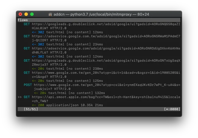 mitmproxyのターミナル上で、先ほどのスマホのデータ通信記録を確認できます。