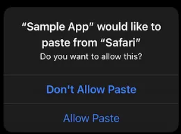 iOS 16以降、ユーザーが自ら貼り付け操作を行わない場合、アプリが剪貼簿を読み取ろうとすると確認ダイアログが表示され、ユーザーが許可しないとアプリは剪貼簿の情報を取得できません。