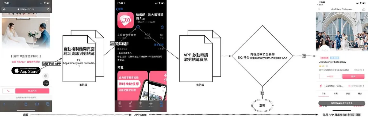 APPが起動時にクリップボードを読み取る主な理由は、「iOS Deferred Deep Link」を使ってユーザー体験を強化するためです。上記の流れのように、ある製品がウェブとAPPの両方を提供している場合、ユーザーにAPPをインストールしてもらいたい(より高いエンゲージメントのため)ため、ユーザーがウェブサイトを閲覧しているときにAPPのダウンロードを促します。しかし、ダウンロード後にAPPを開いたときに、ウェブで見ていたページを自動的に表示させたいのです。