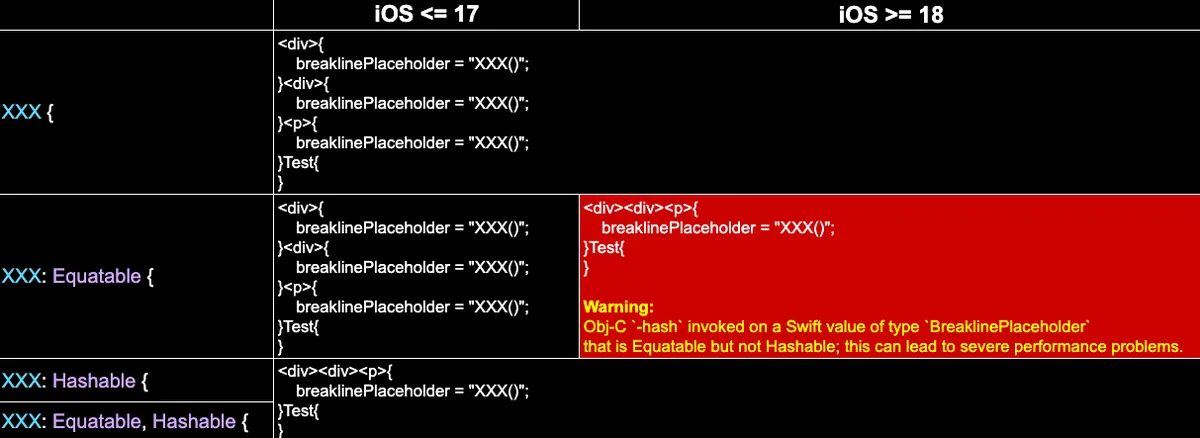 iOS 17/18でEquatable/Hashableが実装されているかどうかの比較結果