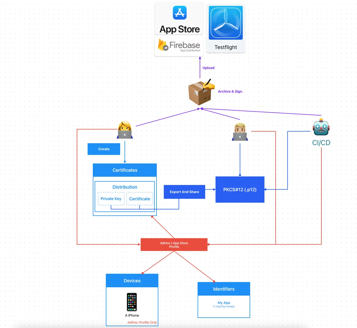 Ad Hoc — 内部テスト用にパッケージ化されたプロビジョニングプロファイル(例:Firebase App Distributionへのデプロイ)で、プロファイルはCertificates、Identifiers、Devicesの関係を含みます。