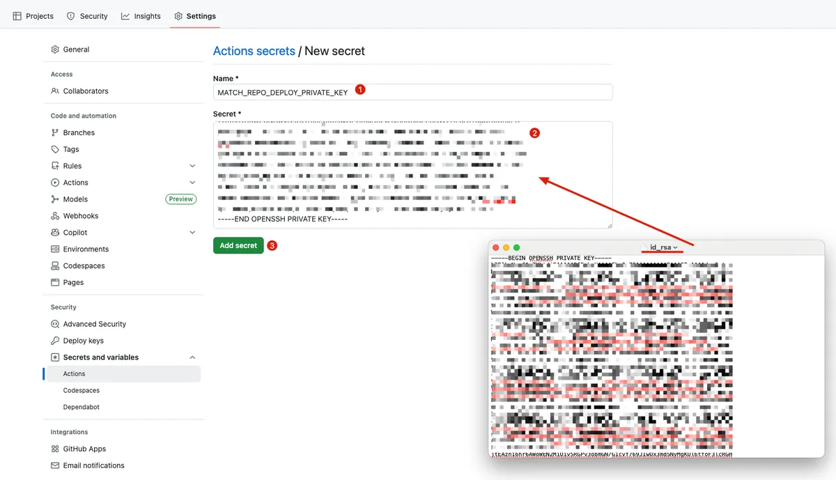 AuthKey_XXXXXX.p8を開き、内容をコピーして貼り付けてください。メインリポジトリのGitHub Actionsに内容を読み取りファイルに書き込むステップを追加: