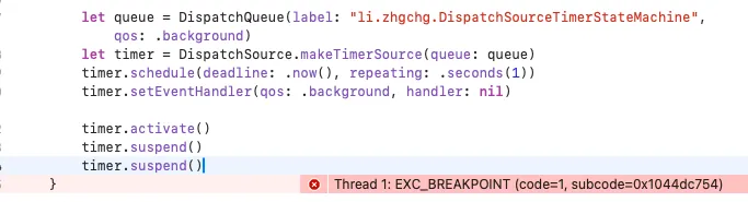 DispatchSourceTimer は activate 、suspend 、resume 、cancel といった多くの操作メソッドを提供していますが、非常に繊細で、呼び出し順序を間違えるとすぐにクラッシュ(EXC_BREAKPOINT/DispatchSourceTimer)するため非常に危険です。