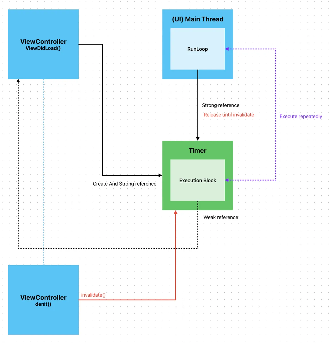 UIメインスレッド上で Timer を作成すると、Timer はメインスレッドの RunLoop に強く保持され、RunLoop のポーリング機構によって定期的にトリガーされます。Timer は invalidate() が呼ばれるまで解放されません。そのため、ViewController で Timer を強く保持し、deinit 時に Timer の invalidate() を呼び出して、画面が終了した後に正しく Timer を停止・解放する必要があります。