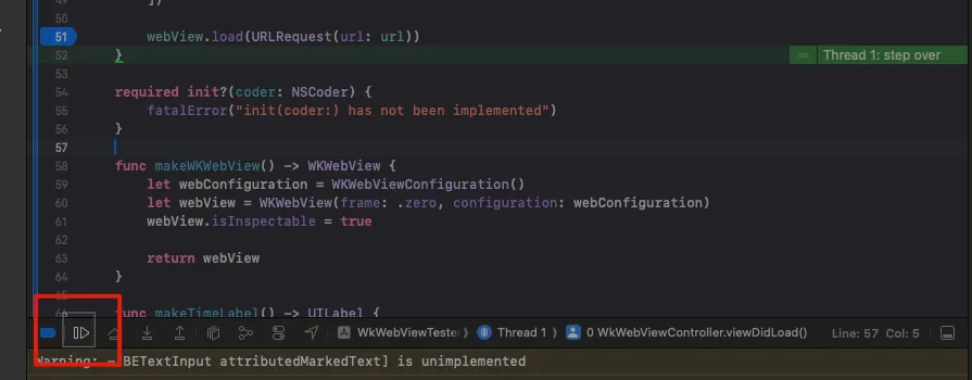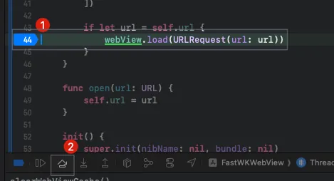 webView.load のブレークポイントに到達したら、「ステップ実行」をクリックしてください。