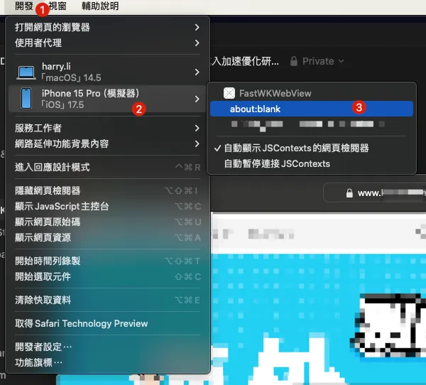 WKWebView に webView.isInspectable = true を設定すると、Debug Build 版で Safari 開発者ツールを使用できます。