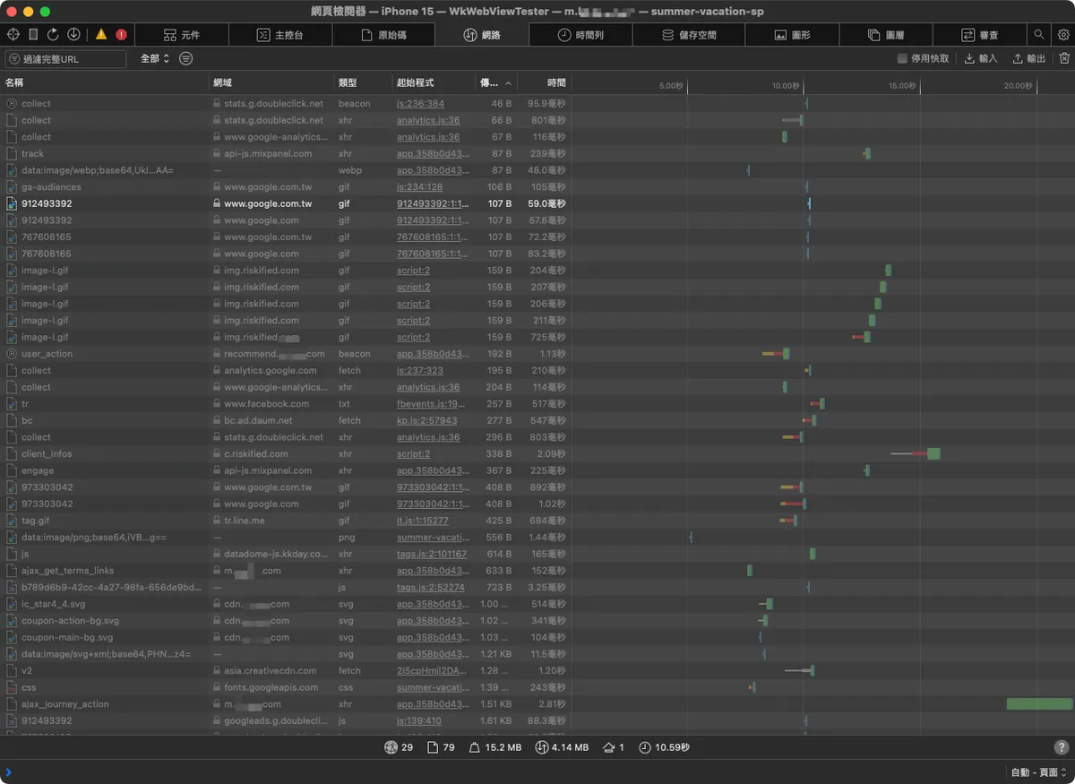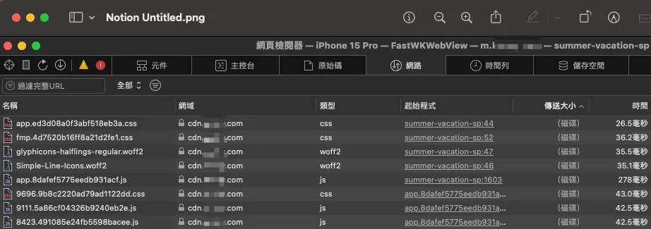 私たちのページでテストすると、ブラウザやWKWebViewはまずページ本体の.htmlをリクエストし、その後必要なリソースを読み込みます。同時にプログラムの指示に従って画面を構築します。記事と比較すると、ページ段階では実際にFirst Paint(空白)からTime To Interactive(First Contentful Paintはナビゲーションバーのみであまりカウントされないと思われます)までしかなく、中間の段階的なレンダリングがユーザーに提供されていません。そのため、ユーザーの全体的な待機時間が長くなります。