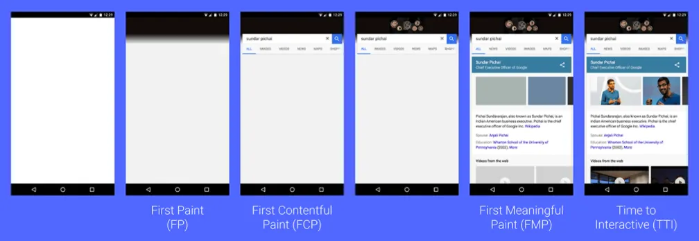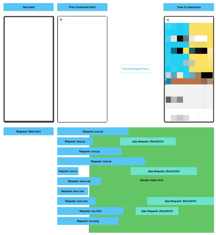 参考 wedevs 優化建議 によると、フロントエンドのHTMLページは4つの読み込み段階があります。最初にページファイル(.html)を読み込み、First Paint(白紙のページ)、次にFirst Contentful Paint(ページの骨組みのレンダリング)、さらにFirst Meaningful Paint(ページ内容の補完)、最後にTime To Interactive(ユーザーが操作可能になる時間)です。