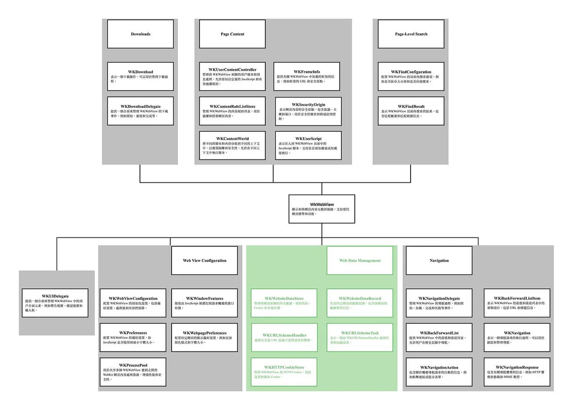 上の図はChatGPT 4oを使って紹介した、Apple iOSのWebKit(WKWebView)に関するすべてのメソッドと簡単な説明です。緑色の部分はデータ保存に関係するメソッドです。