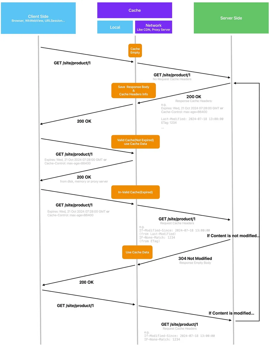 サーバーのレスポンスキャッシュ戦略はResponse Headerにあり、システムのURLSessionやWKWebViewはCache Headerに従って自動的にレスポンスをキャッシュし、後続のリクエストにも自動的にこの戦略を適用します。